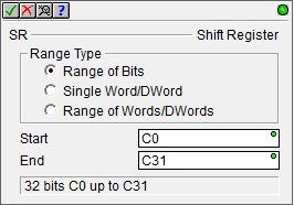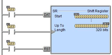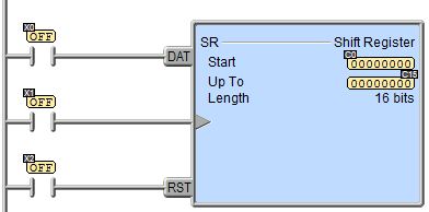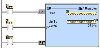 The Shift Register (SR) instruction shifts BITs through a predefined number of BIT locations. These BIT locations can be a range of BITs, a single Word or DWord, or a range of Words or DWords.
