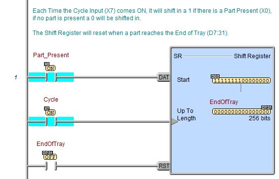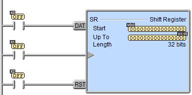 The Shift Register (SR) instruction shifts BITs through a predefined number of BIT locations. These BIT locations can be a range of BITs, a single Word or DWord, or a range of Words or DWords.